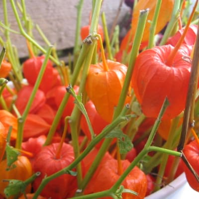 Crocosmia × crocosmiiflora 24-36" tall. Midsummer sprays of bright red flowers open from bottom to top on long arching bronze stems. Grows well in pots. Makes a long-lasting cutflower.