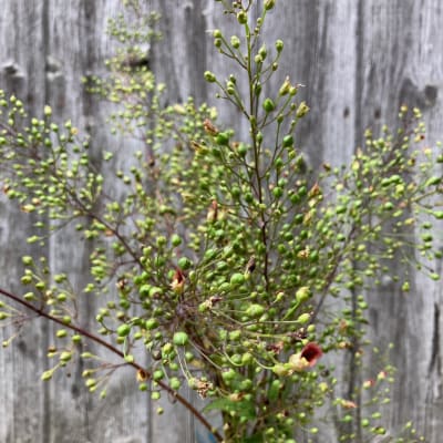 Talinum paniculatum (95 days) Open pollinated. Petite pink flowers on thin stems mature into airy glistening bronze-to-burgundy sprays of teensy seedpods. Annual.