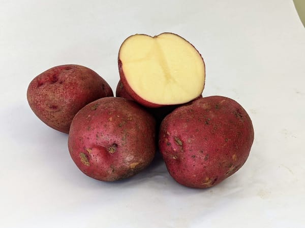Brace yourself for staggering yields! Red Maria will fill the root cellar, or satisfy your market’s bulk red-potato niche. Maria’s skin hue has less visual exuberance than her sister Strawberry Paw’s, but fulfills the needs of 98% of the red-potato customers. Super-sweet moist flesh. Excellent dormancy retention in winter storage.