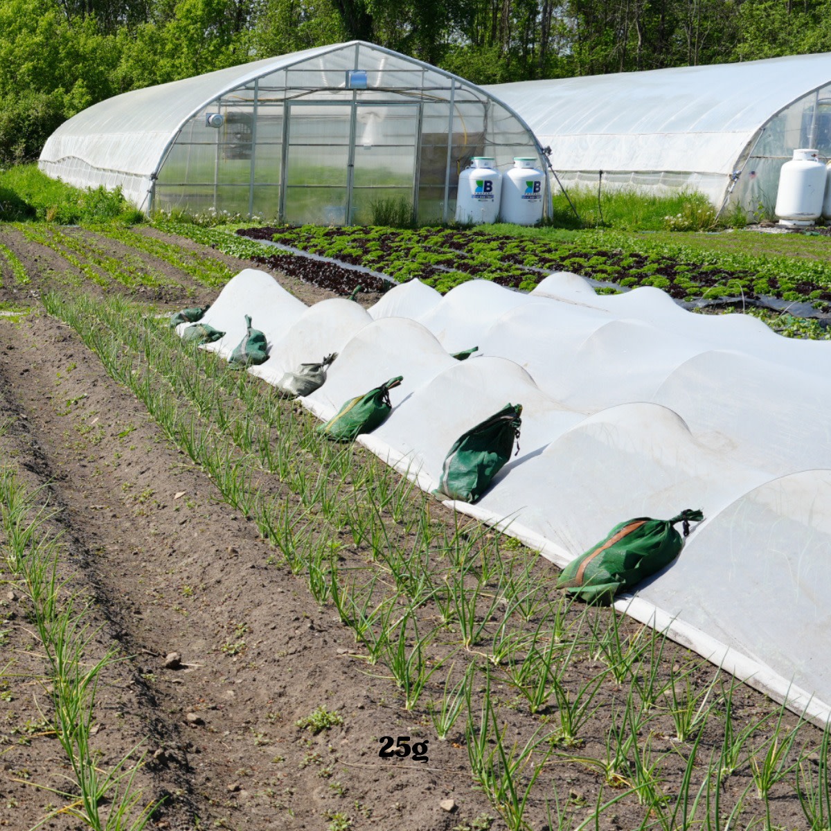 Ideal for securing edges of floating row covers and tarps. While earth staples puncture fabrics, these bags keep edges intact. Simply fill the bag with crushed stone (sand or gravel will also work) and secure the fastener. It’s the handle that really makes these bags stand out against competitors; these bags are so easy to grab and move around! Furthermore, the UV-resistant high-density polyethylene fabric is rated to last 7 growing seasons—good luck finding another row bag that lasts nearly that long!
