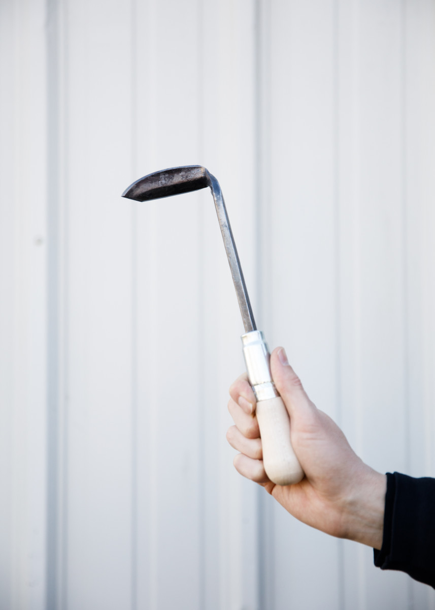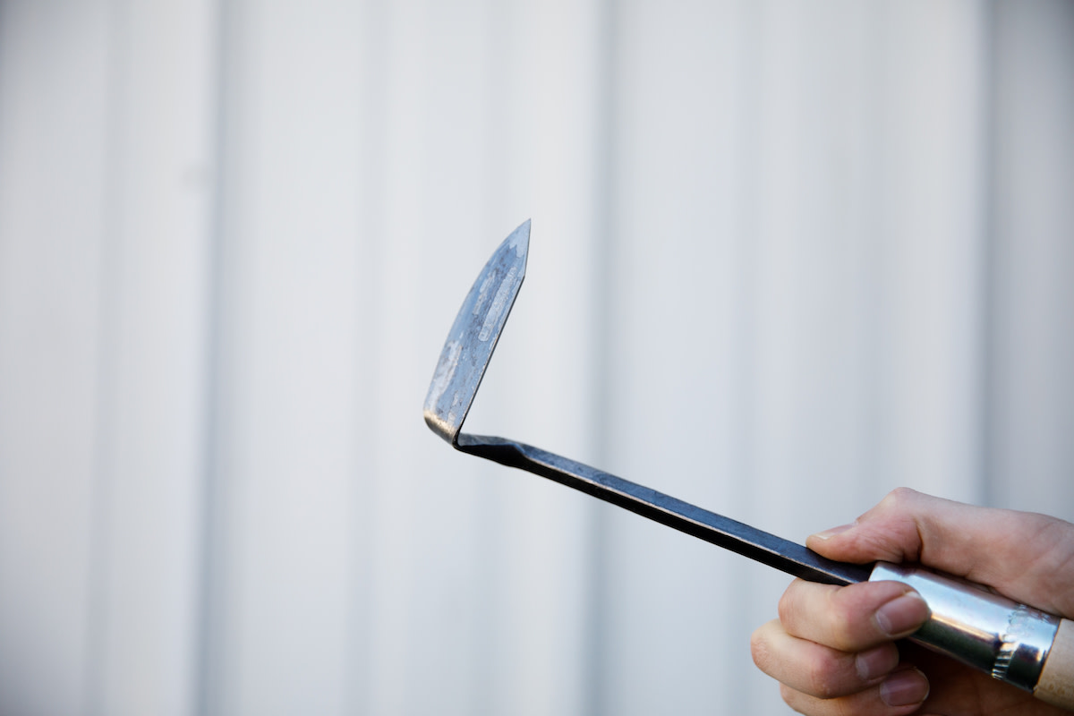 The 3 ¼" x ⅞" blade is set at right angles to the shaft with beveled sharpened edges to separate weeds from their roots just below the soil surface. Minimizes soil disturbance and thus reduces likelihood of allowing more weed seeds to germinate. Fedco’s legendary Gene Frey calls it his favorite hand tool! Overall length 12". Actual weight ~10 ounces.
