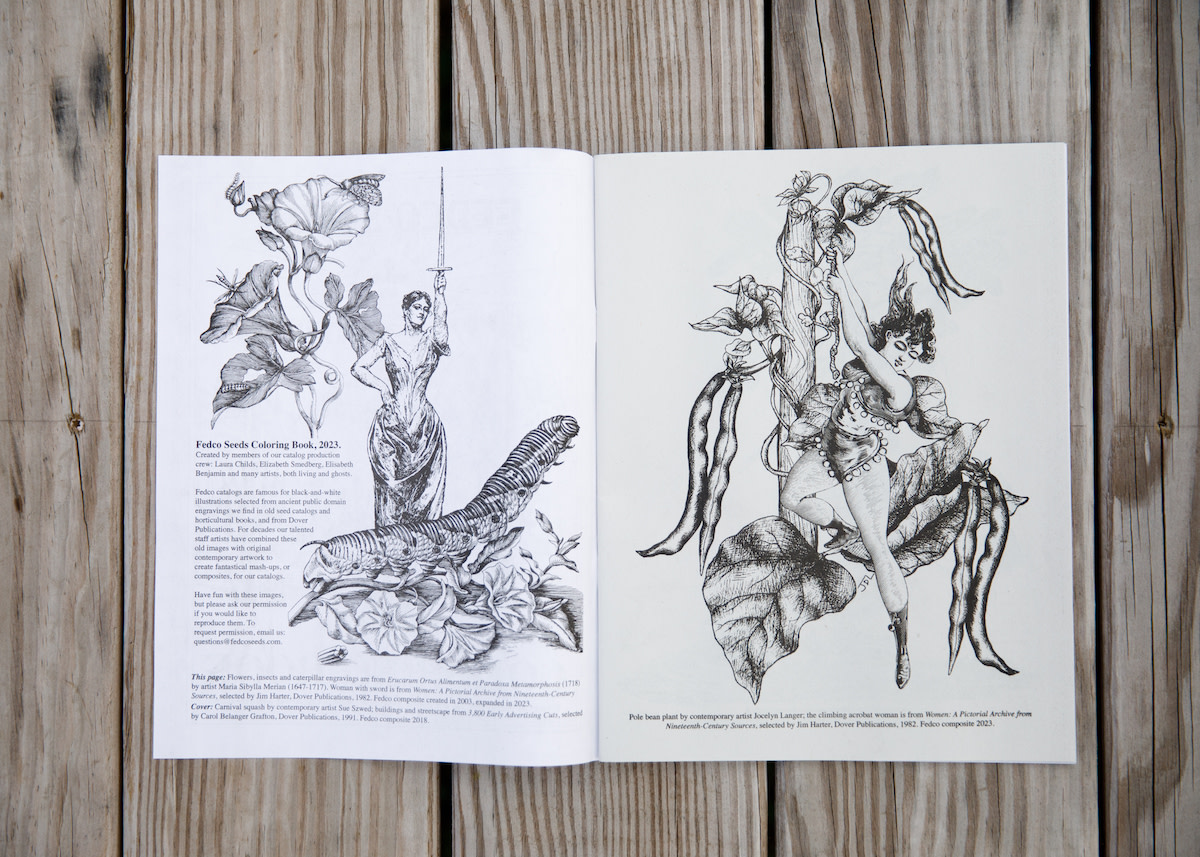 by the Fedco catalog crew, 48 pages, 10¾x8¼, newsprint (printed one-sided so no bleed-through). Fedco catalogs are famous for black-and-white illustrations selected from ancient public domain engravings we find in old seed catalogs, horticultural books, and from Dover Publications.