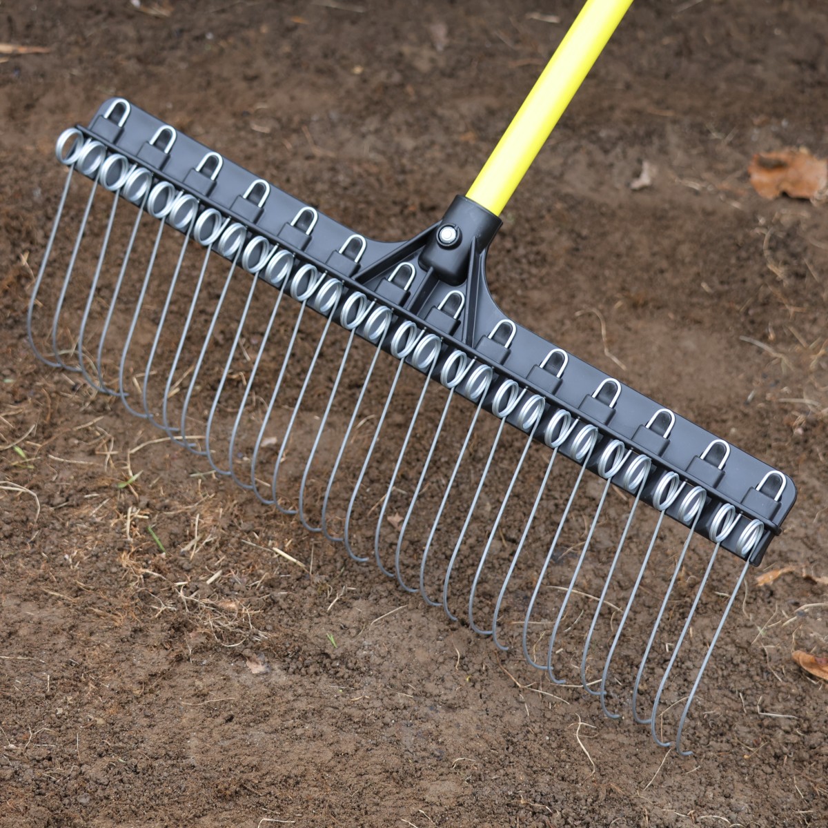 The swivel hanger on top of the handle makes the tool easy to store. The strong copolymer rake head is 21" wide; fiberglass handle is 55" long. Tines are replaceable. Lifetime warranty against defects in manufacturing. Head and handle ship separately.