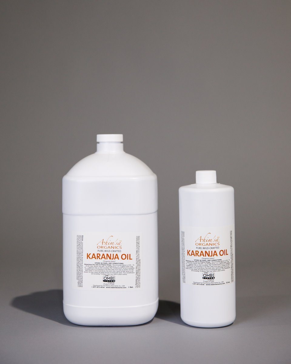 To make a spray, mix 1 oz karanja oil (or ½ karanja and ½ neem oil) with 2 tsp biodegradable dish soap, and add to 1 gal lukewarm water.