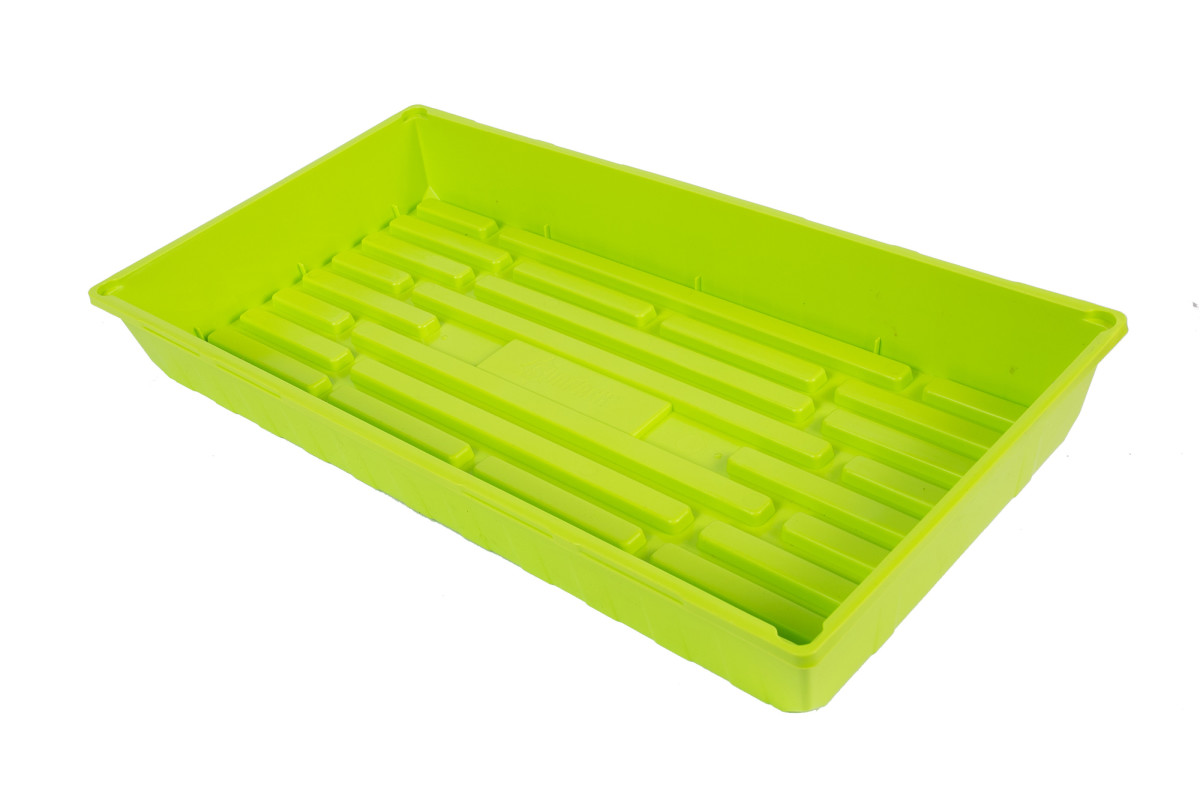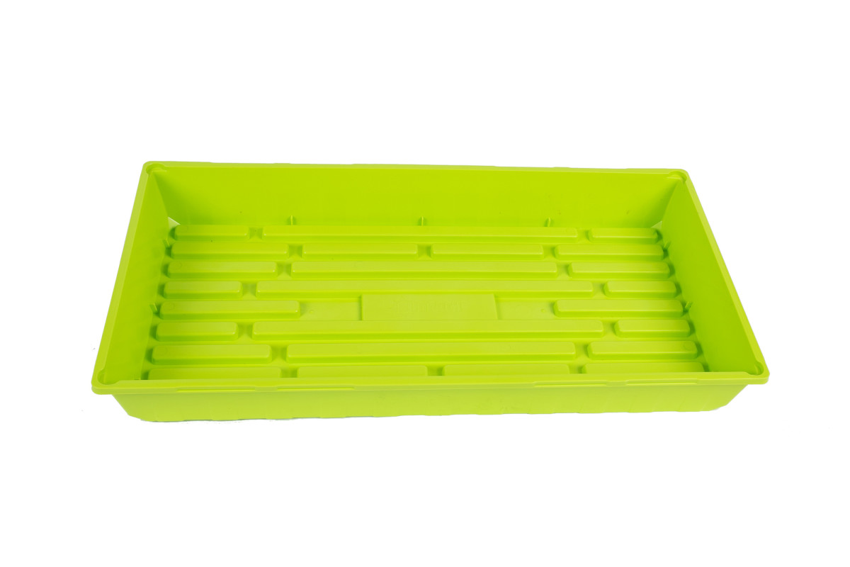 These super-solid injection-molded SUNPACK trays have no drainage holes, so they’re leak-proof and great for bottom-watering. Ribs along the bottom provide good airflow for whichever pots or cell trays you set in them. With the rib height subtracted, there is 2¼" usable depth. Outer dimensions: 11x21⅛". Comes in multiple colors.