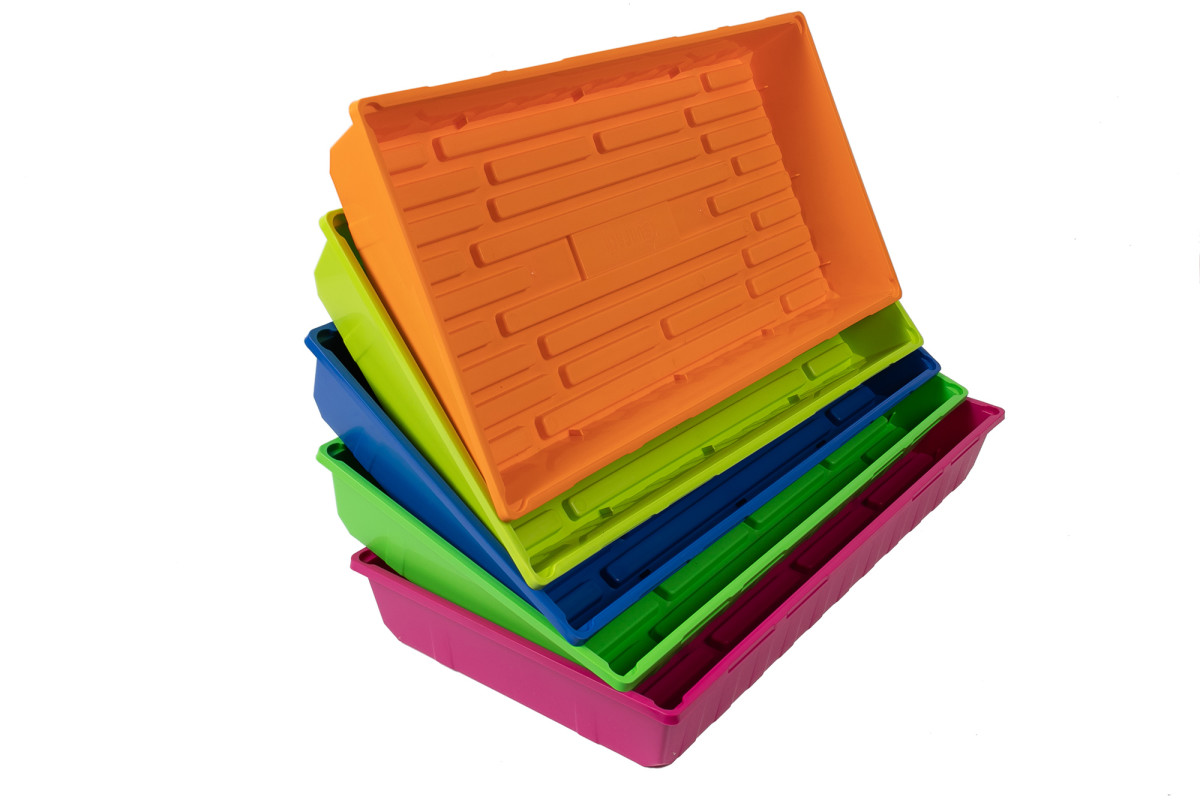 These super-solid injection-molded SUNPACK trays have no drainage holes, so they’re leak-proof and great for bottom-watering. Ribs along the bottom provide good airflow for whichever pots or cell trays you set in them. With the rib height subtracted, there is 2¼" usable depth. Outer dimensions: 11x21⅛". You can also buy single trays separately in multiple colors.