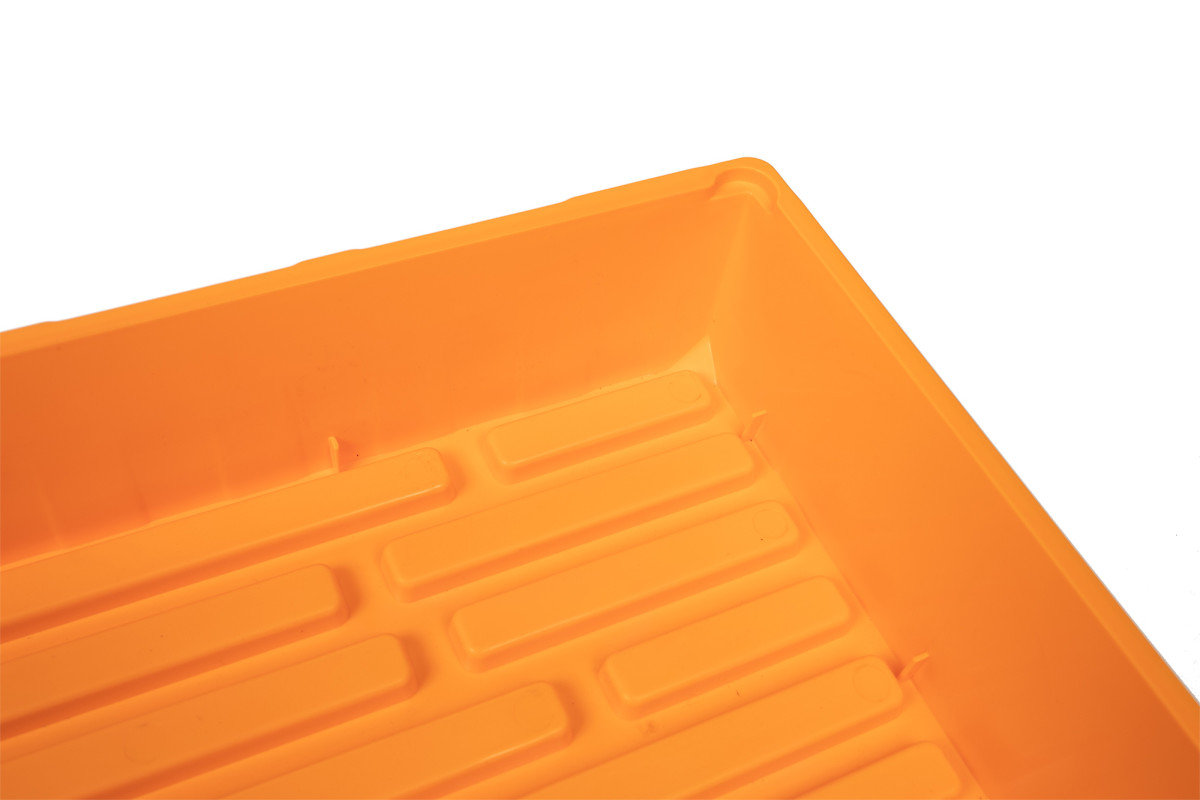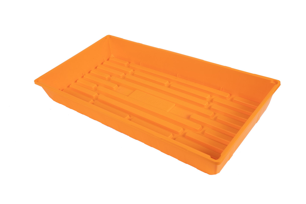 These super-solid injection-molded SUNPACK trays have no drainage holes, so they’re leak-proof and great for bottom-watering. Ribs along the bottom provide good airflow for whichever pots or cell trays you set in them. With the rib height subtracted, there is 2¼" usable depth. Outer dimensions: 11x21⅛". Comes in multiple colors.