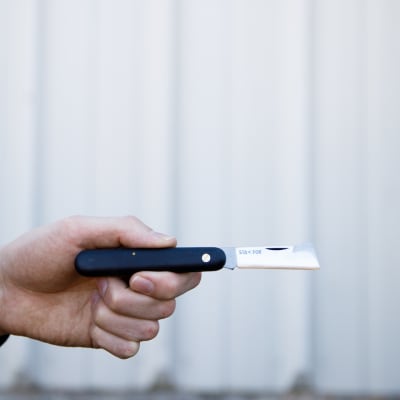 This carbon steel grafting knife with 2¼" blade is beveled on only one face so the cut is as flat as possible. Manufactured by Stafor in Italy.