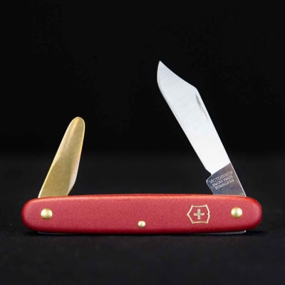 This stainless steel grafting knife with 2¼" blade is beveled on only one face so the cut is as flat as possible. Manufactured by Victorinox in Switzerland.