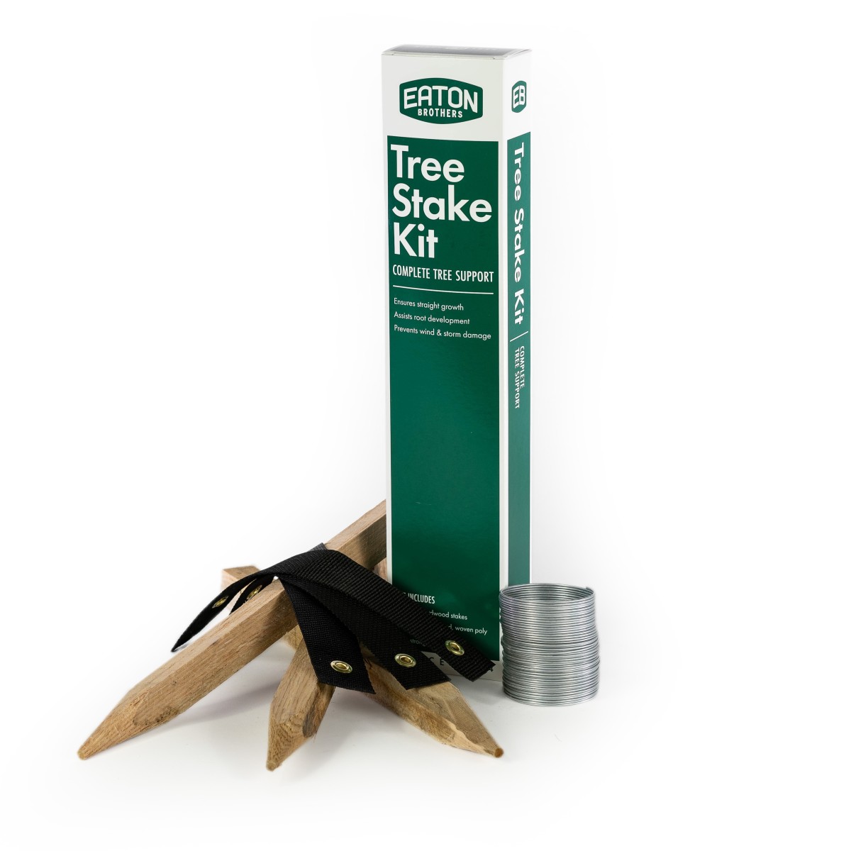Includes three 16" notched and pointed hardwood stakes, three 10" grommeted woven poly straps, and 30' strong galvanized wire. Easy to install.