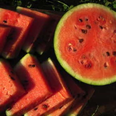 Citrullus lanatus (82 days) Open pollinated. Modern classic. Red flesh with few seeds. Round-to-oval 8-12 lb fruit with dark green stripes on light green base.