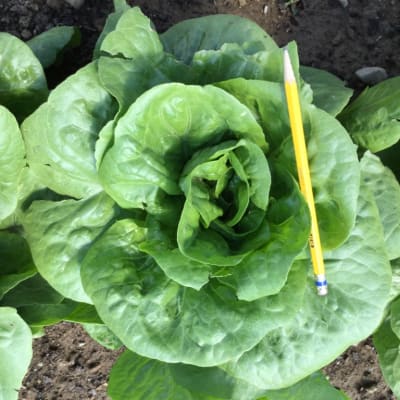 Lactuca sativa (46 days) Open pollinated. Folded and blistered light green leaves wrap into a tight crisp whorled 4" head that easily makes a single-serving salad.