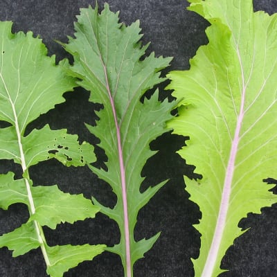 Brassica oleracea (acephala group) (61 days) Open pollinated. Lacinato crossed with Redbor. Curly edges, red veins, purple or blue-green leaves, diverse shapes and colors. Productive and cold-hardy.
