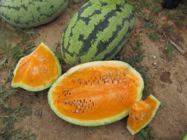 The most orange of watermelons, much favored by Glenn Drowns. Not the sweetest of our melons, but its crisp tender bright orange flesh is juicy and refreshing with an almost tropical flavor. Adapted to the Northeast and every bit as good as Drowns promised, the striped oblong melons average 10 and often achieve 15 lb. Let them stay in the field an extra few days when the stem is drying because they reach full sweetness only when completely ripe. Large, plentiful seeds. WSU Brix rating of 10.7. Orangeglo - Organic