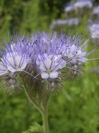 Annual. Also called Fiddleneck and Purple Tansy. The small frizzy curling lavender-blue sprays of this bushy 18–30" annual bloom for two months and provide high-quality pollen and nectar, making it one of the most popular insectary plants for honeybees, bumblebees and syrphid flies. Phacelia honey is clear and delicate. Flowering begins 6–8 weeks after germination, though the plant needs 13 hours of daylight to bloom. Used as a cover crop or intercropped in row plantings, it can increase beneficial insect diversity and populations in gardens, fields, orchards and vineyards while suppressing weeds. It winter kills at 18° and can be turned under. Feathery leaves look similar to Sweet Cicely. Seed will germinate in cold soils, but requires darkness. Native to southwestern US and northern Mexico. Thrives in dry to moist soils. About 280 seeds/g.