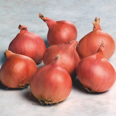Allium cepa (aggregatum group) (110 days) F-1 hybrid. Lustrous pinky-bronze shallot with elongated 4–5" bulbs that are easy to peel and slice. Sweet and slightly citrusy when raw, also great sautéed.
