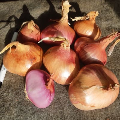 Allium cepa (aggregatum group) (105 days) Open pollinated. Handsome golden-bronze 1¼–2" bulbs uniformly divide into triples and quadruples, store into the spring, and have a luxurious caramel flavor.