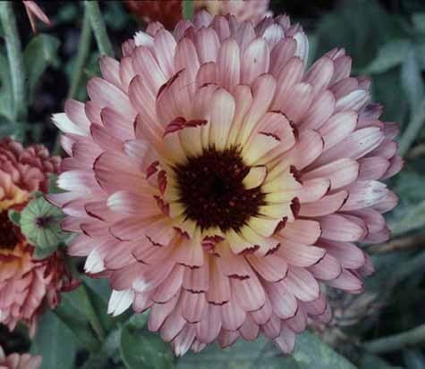 Annual. Pinky-maroon backing shows through the yellow petals to lend a pink tinge to the familiar calendula-yellow. Dark centers accentuate the color contrast. A Frank Morton original.
