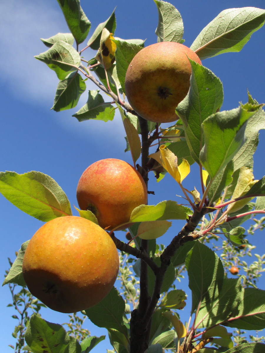 Medium-small oblate and lopsided orange-gold-green russet fruits ripen in October. Store until New Year to reach perfection. Keeps until they’re all gone.