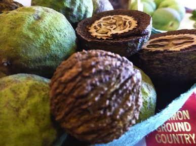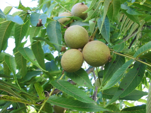 A spectacular shade tree with a magnificent open rounded crown of massive limbs with dark green leaves. Harder to crack than commercial English walnuts but worth the effort for their distinct sweet earthy rich flavor. Eat them chopped on fresh salads, or with dark chocolate for dessert.