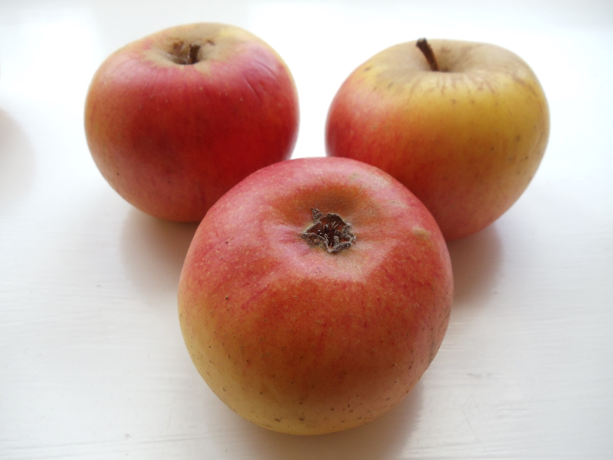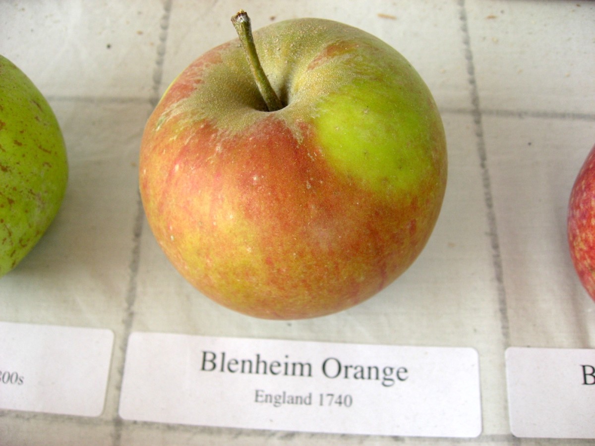 Large beautiful rich-yellow oblate fruit with a prominent red blush and a big russet splash surrounding the stem. The Apples of New York calls Blenheim “excellent for either dessert or culinary use.” Crisp and juicy. Keeps until about mid-December.
