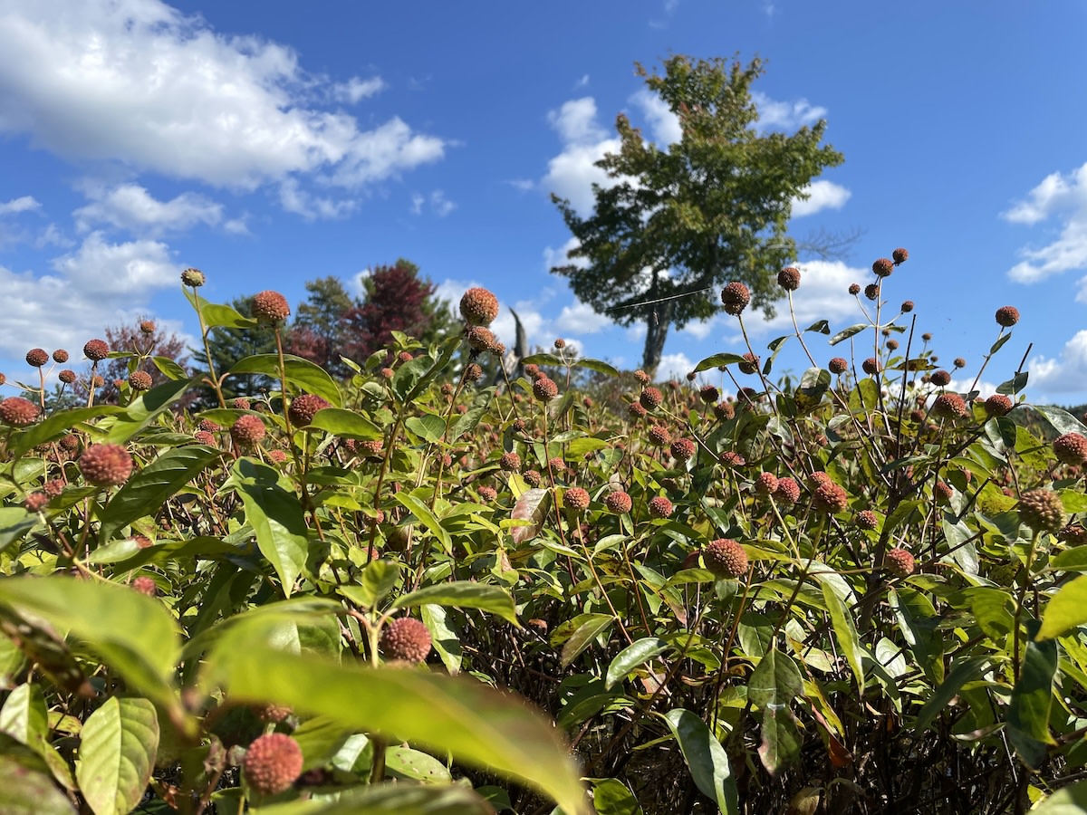 6-10' × 8' Loose rounded branchy shrub with masses of unusual spherical fragrant white flowers that appear for 4–6 weeks in summer—a magnet for every honeybee around.