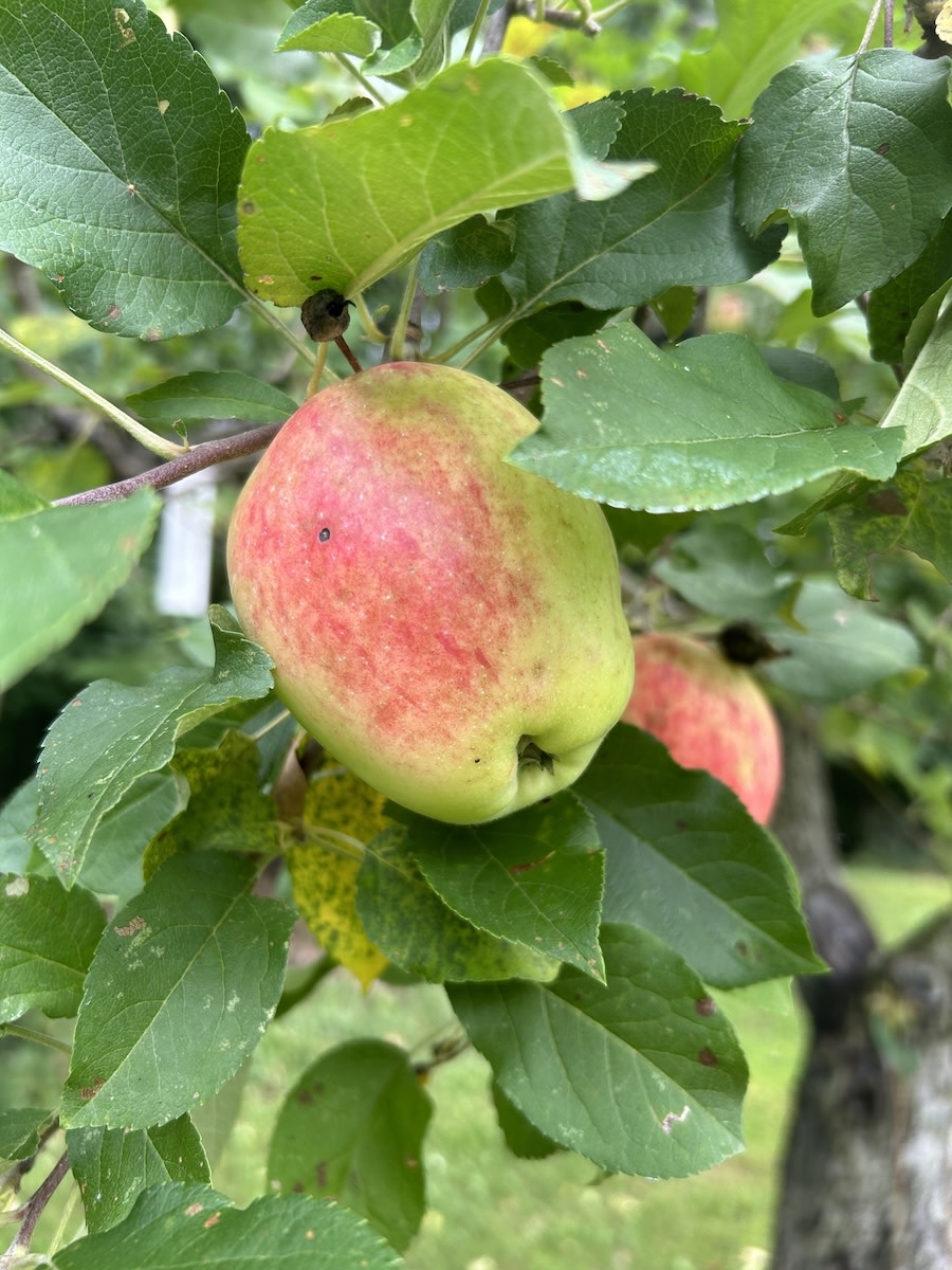 Excellent tender-skinned tender-fleshed dessert and cooking apple ripens over several weeks in September. Subacid and aromatic. Yellowish-white skin covered with soft pastel pinky-red “strawberry” stripes and a very long famously distinctive conic strawberry shape. One of the more famous American heirlooms—there’s no other apple like it. Originally called Frank, after the man who first introduced the variety. Another early synonym was Jackson Apple, possibly his last name. Also known by several other synonyms including Zepherus Chernogous. Wow!