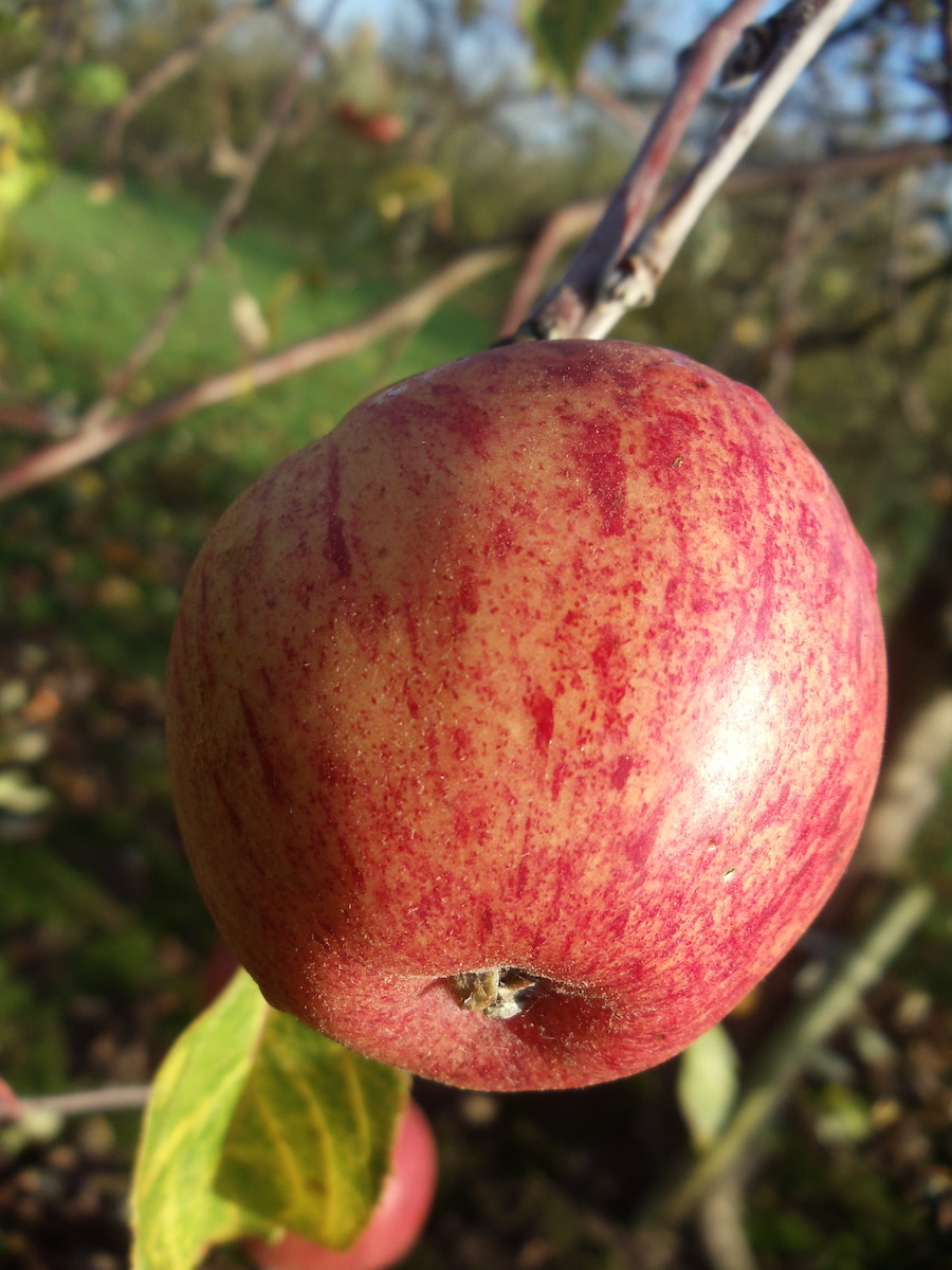 Large oddly conic fruit, sometimes ribbed, mostly striped and blushed with red. White-fleshed, sweet, crisp and juicy. Soft, astringent, tannic. Still grown in England’s West Country cider orchards and now being planted in the U.S.