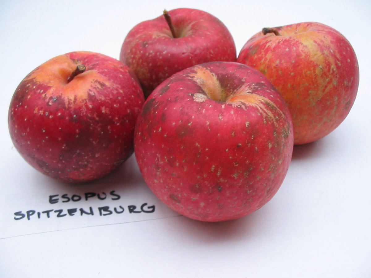 For more than 200 years “Spitz” has been a choice dessert and culinary variety, mentioned in nearly every list of best-flavored apples. Slightly subacid, crisp and juicy. Excellent acid source for sweet or fermented cider. Medium-large bright red round-conic fruit, covered with russet dots. Moderately vigorous tree with easily trained wide-angle branches. Forever famous as Thomas Jefferson’s favorite apple though it performs much better in New York and New England than Virginia.