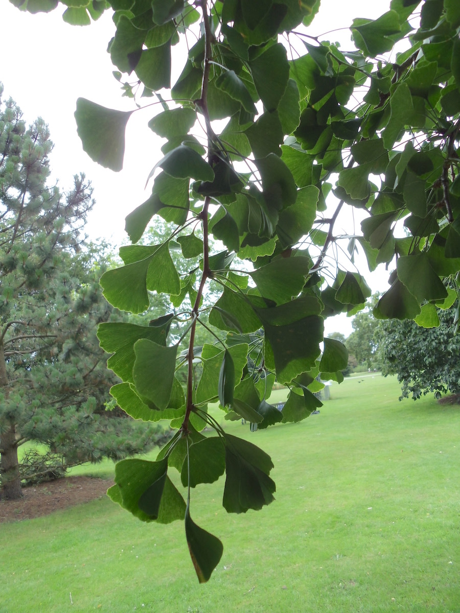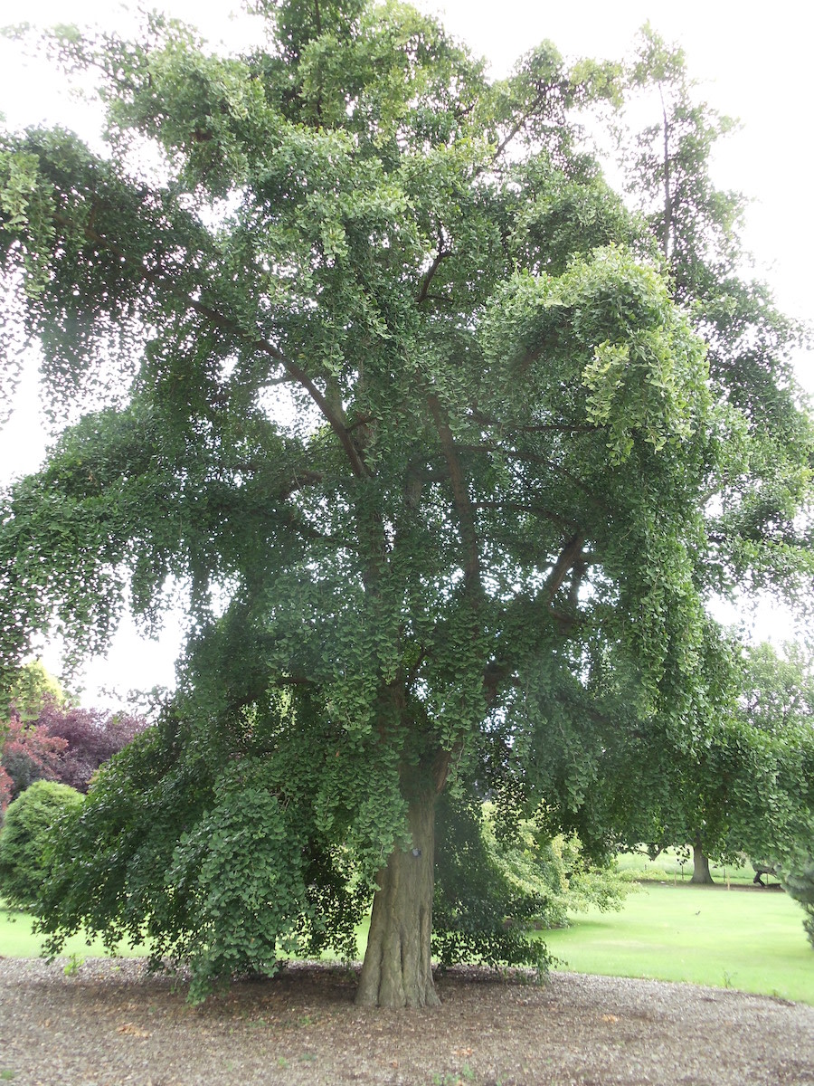 Considered the oldest living genus of seed plants; grew in North America in the time of the dinosaurs. There are 3000-year-old specimens in China. Upright tree when young with branches that spike out and up like the rays of the sun, eventually becoming wide-spreading and graceful. Slow-growing, can be extremely long-lived. Unique fan-shaped foliage turns sparkling golden-yellow in fall, then all at once the leaves drop and within hours the tree is bare. Famous for their edible nut-like “fruit,” which botanically speaking is actually a gametophyte. Once the flesh is removed the softish nuts can be used in stir-fries. Leaf tea used to enhance circulation to the brain and extremities.