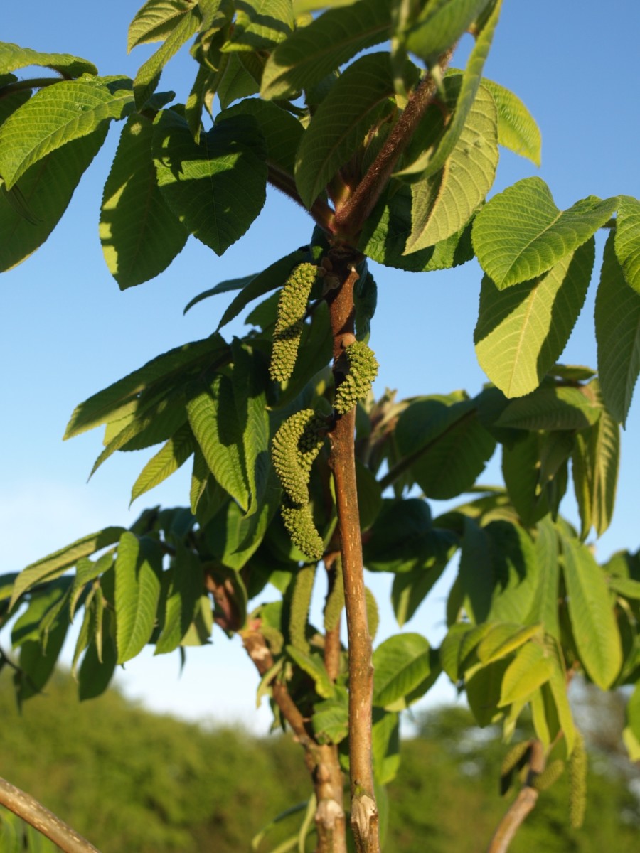 Clusters of 4–10 nuts containing sweet flavorful meat follow showy spring catkins. Ornamental yellow-green pinnate leaves. Husks can be used to make a yellow dye. Starts bearing fruit in 3–5 years.