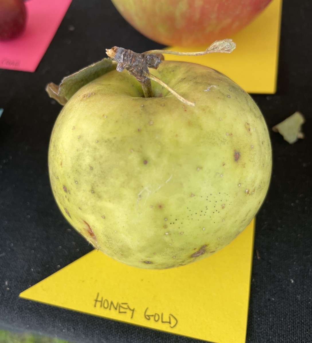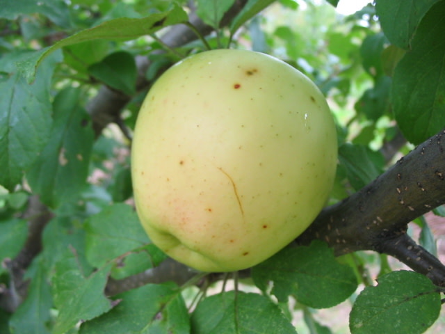 A Golden Delicious for the north. Large round-to-conic golden-yellow bronze-blushed aromatic fruit has crisp and juicy yellow flesh with high-flavored Golden Delicious quality. Has a very nice zing to it. Harvest in October. Keeps all winter.