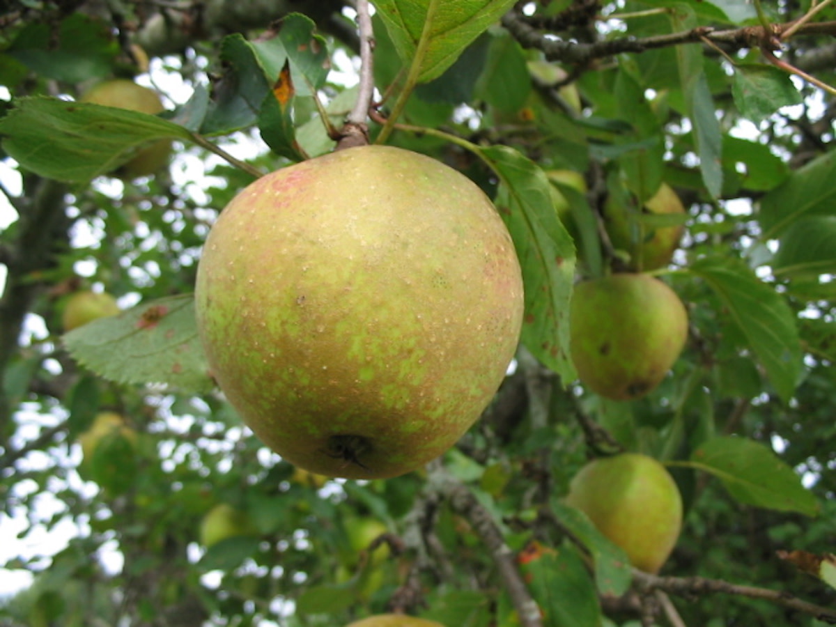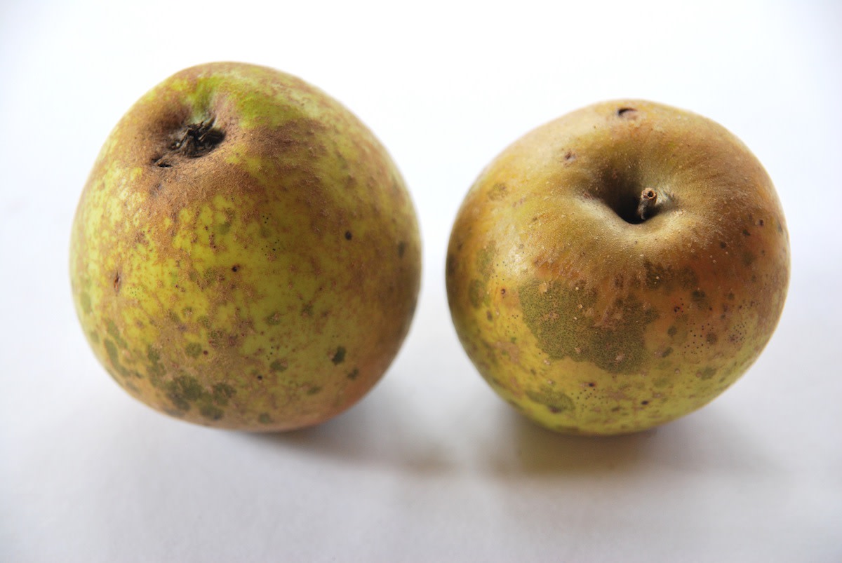 This unforgettable large russet apple is sometimes called Cathead because of its distinctive shape: a large stem end tapering to a small blossom end, typical of some Irish varieties and of the cats’ noggins. About half russet and half deep rich lime green. Good fall and early winter eating, excellent for cooking, drying and even frying. The slightly yellow flesh is mild, moderately crisp, moderately tart and subtle. Quickly cooks up into a frothy yellowish sauce—tart, tasty, thick, incredibly creamy with skins dissolved. No sugar necessary.