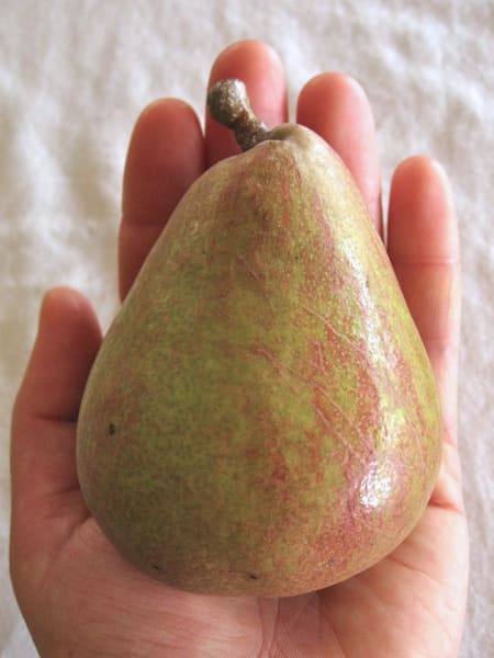 Medium-sized fruit is greenish-yellow with a light dull-bronze russeting, sometimes a crimson blush, and a short pyriform shape. Fruit set can be inconsistent, though we heard of one grower who got excellent fruit set by mashing up flowers from other pear varieties and spraying them on his Magness when it was in full bloom. Keeps more than two months with refrigeration.