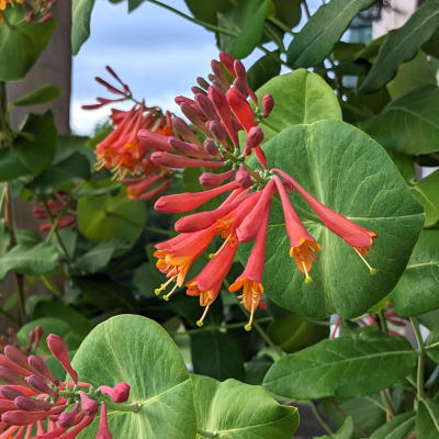 Lonicera × brownii 10-20'. Tall climbing honeysuckle. Non-invasive! Attractive to pollinators, especially hummingbirds. Species is native to North America. Z3.