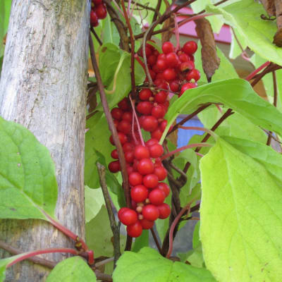 Schisandra chinensis 20' or taller. Ornamental vines produce flavorful medicinal berries. Adaptogenic fruit used to build the immune system and rejuvenate the body. Z4.