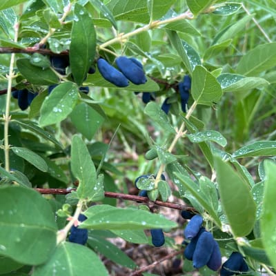 Gaylussacia baccata 1-3' x 2-4'. Cousin of the blueberry. Less acidic, more mildly sweet flavor. Flowers in June, fruits in August. Full sun to part shade but fruits best in sun. Native to eastern U.S. and Canada. Z3/4.