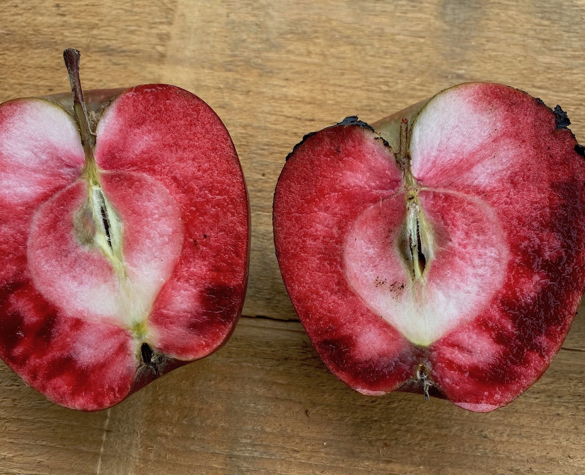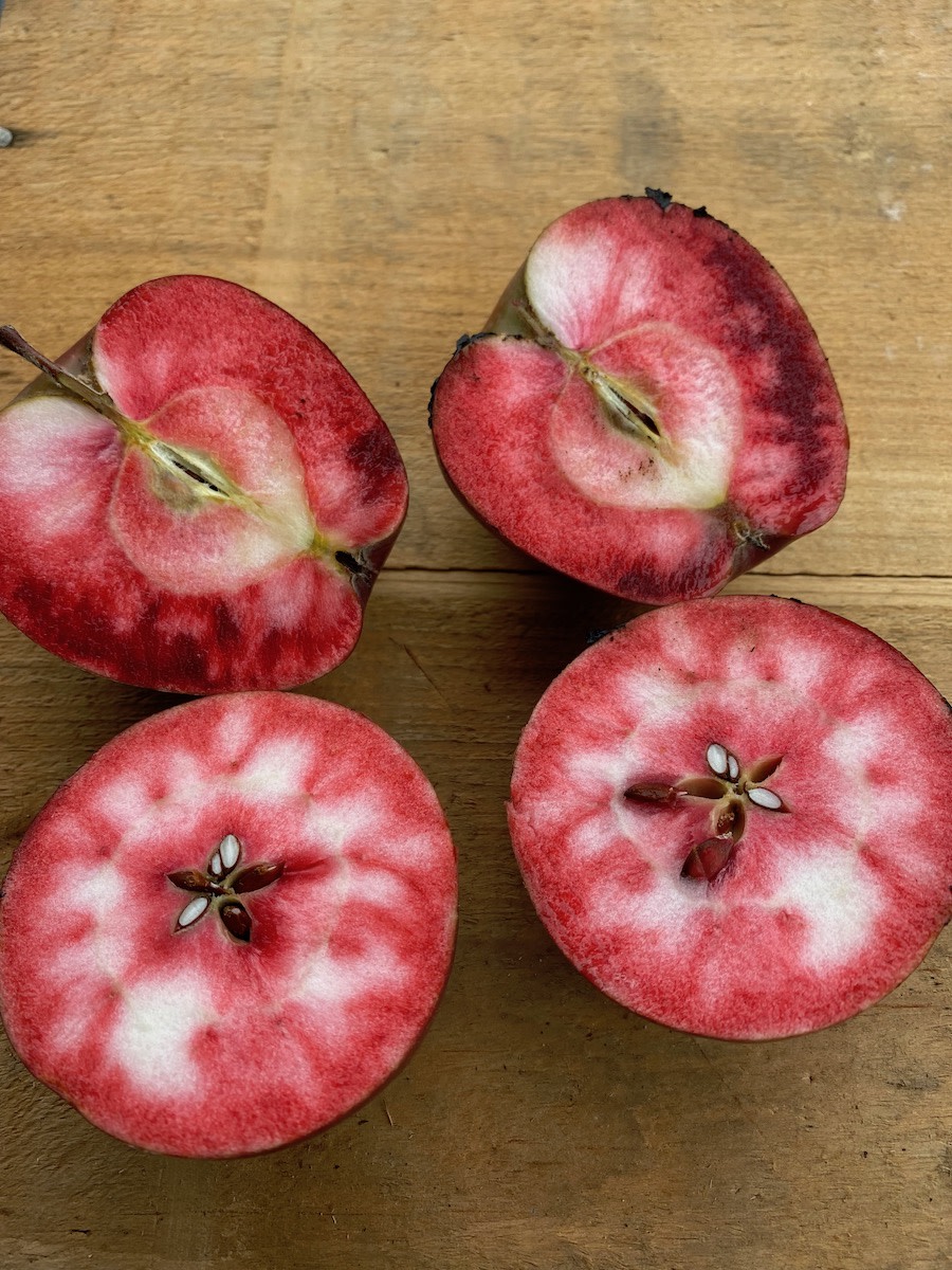 Otterson was selected as one of the best from more than a hundred varieties for its size, vigor and disease resistance, as well as its deep red juice, high in anthocyanins and antioxidants. Medium-sized round fruit are DARK red inside and out. Cidermakers have pressed and fermented Otterson into rosé cider, winning honors at the Great Lakes International Cider and Perry Competition.