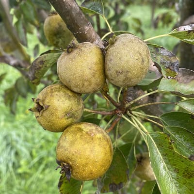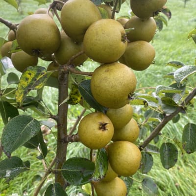 Pyrus communis Fall. Mild-bittersweet perry pear. Fruits easily shaken from tree when ripe. Low in acid and tannin and a great sweet addition to perry blends. Not for fresh eating. Z4.