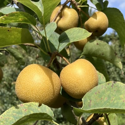 Pyrus pyrifolia Late summer. Large fruit with sweet crisp juicy flesh. Candy-sweet with aromatic flavors of caramel. Great for fresh eating and canning. Stores two months. Z4/5.