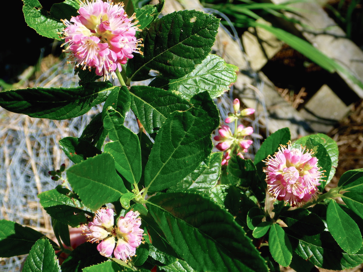 4-5' × same. Sport of ‘Pink Spires.’ Broken Arrow Nursery, Hamden, Conn., 1992.Also known as Sweet Pepperbush. Red buds and beautiful spires of heavenly scented deep-pink flowers appear on racemes for six weeks in midsummer. Bees and butterflies love it. Whorls of extremely attractive finely serrated distinctly veined glossy dark green foliage turn deep gold in fall. Dangling racemes of “black peppercorns” persist into the next growing season.