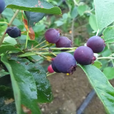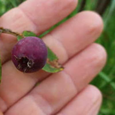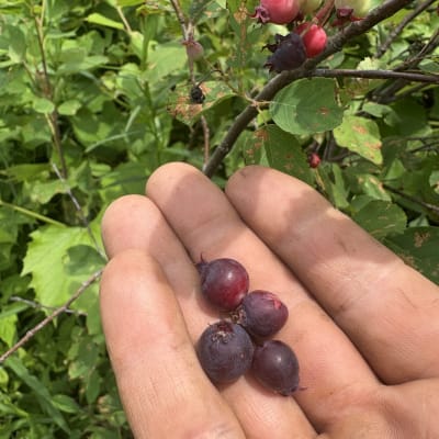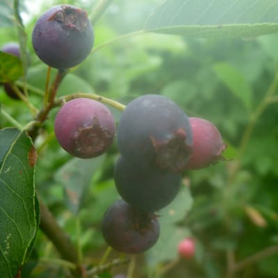 Also called Juneberry, Parsonberry, Serviceberry, Shadblow, Shadbush and Shad. Purplish-black sweet berries great for pies, cobblers, jellies, jams, smoothies and cakes. Fruits are about the size of a lowbush blueberry, or a bit larger. Botanically speaking, the “berries” are actually tiny pomes, more closely related to apples and pears than blueberries. The seeds are also larger and more noticeable than those of other berries and add a satisfying nutty crunch. Saskatoons are highly nutritious and were traditionally prized by Indigenous North American peoples for their medicinal properties and as a key ingredient in pemmican. Fruit ripens in mid-July in central Maine.