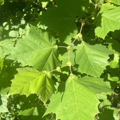 Platanus occidentalis 75-100' x same. Extraordinary native shade tree. Trunks and stems are strikingly mottled. Remarkable against the winter sky. Z4/5.