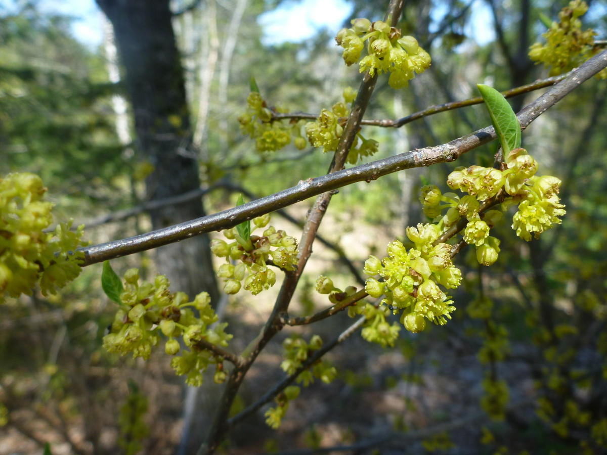 Large rounded multi-stemmed native shrub suited to naturalizing in moist or wet areas, singly or in groups. Soft-yellow flowers early in spring followed by small clusters of glossy red berries (drupes) by mid to late summer. Blue-green foliage turns golden yellow in fall. Edible berries and medicinal twigs and bark.