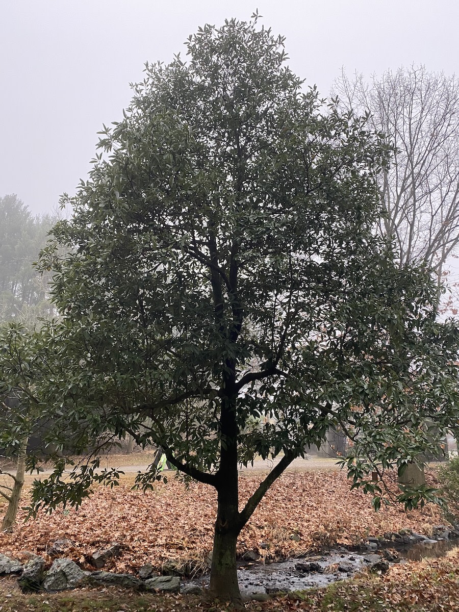 Fragrant creamy white 2–3" waxy blossoms in midspring sometimes rebloom in midsummer. Bright green oblong leaves with silver undersides are semi-evergreen in the North where the plant’s form tends toward a large open irregular multi-stemmed shrub; in the South it grows into a tall evergreen shade tree. The impressive specimen we saw at the Arnold Arboretum held its leaves all winter. Pink “fruits” hold bright red seeds and adorn the tree in fall. Happy in acidic damp soil, like at a pond edge, but adaptable to well-drained areas, too. Tolerates clay and air pollution. Full sun to part shade. Native to the southeastern U.S. mid-Atlantic region. Z5.