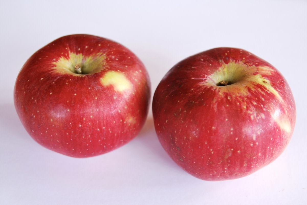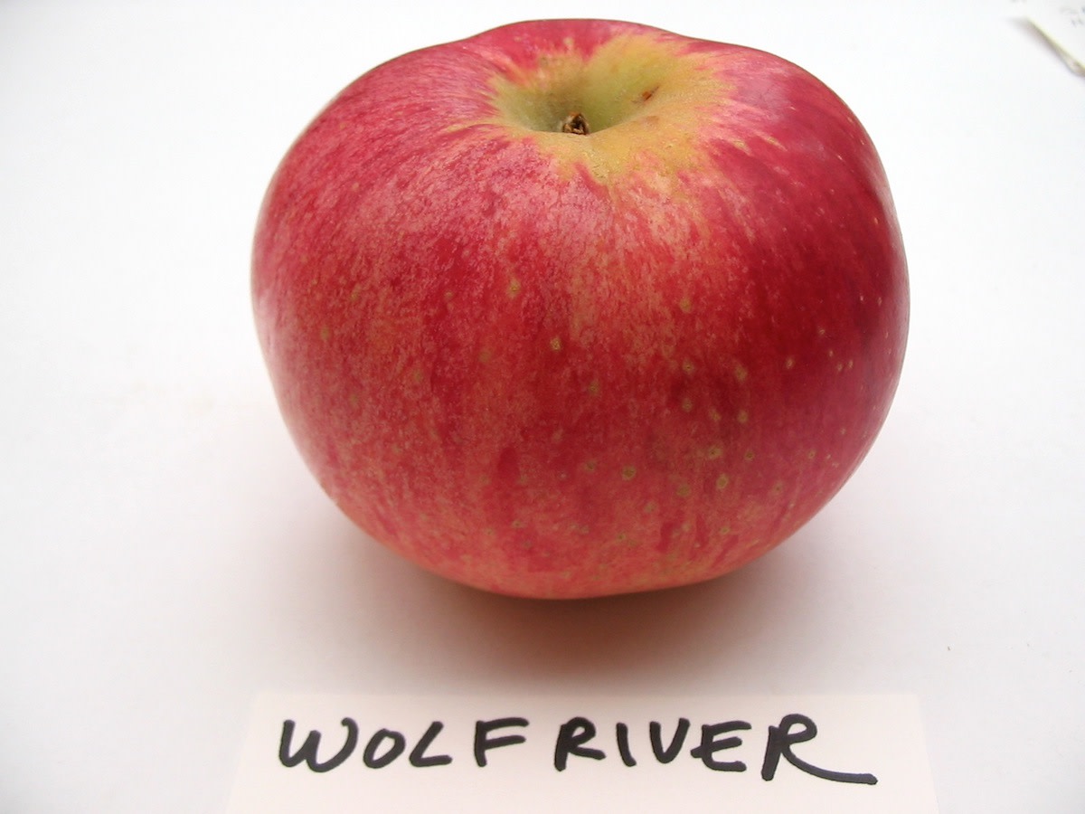 Perhaps the most famous old-time apple in Maine, likely due to its catchy name and its extremely large—even huge—round-oblate fruit. Giant Wolf River specimens always stand out in our apple displays at the Common Ground Country Fair. Pale yellow-green skin mostly covered with pink, deep red and bright crimson with a vivid yellowish-greenish russety splash around the stem. Creamy-white coarse flesh is firm but tender.