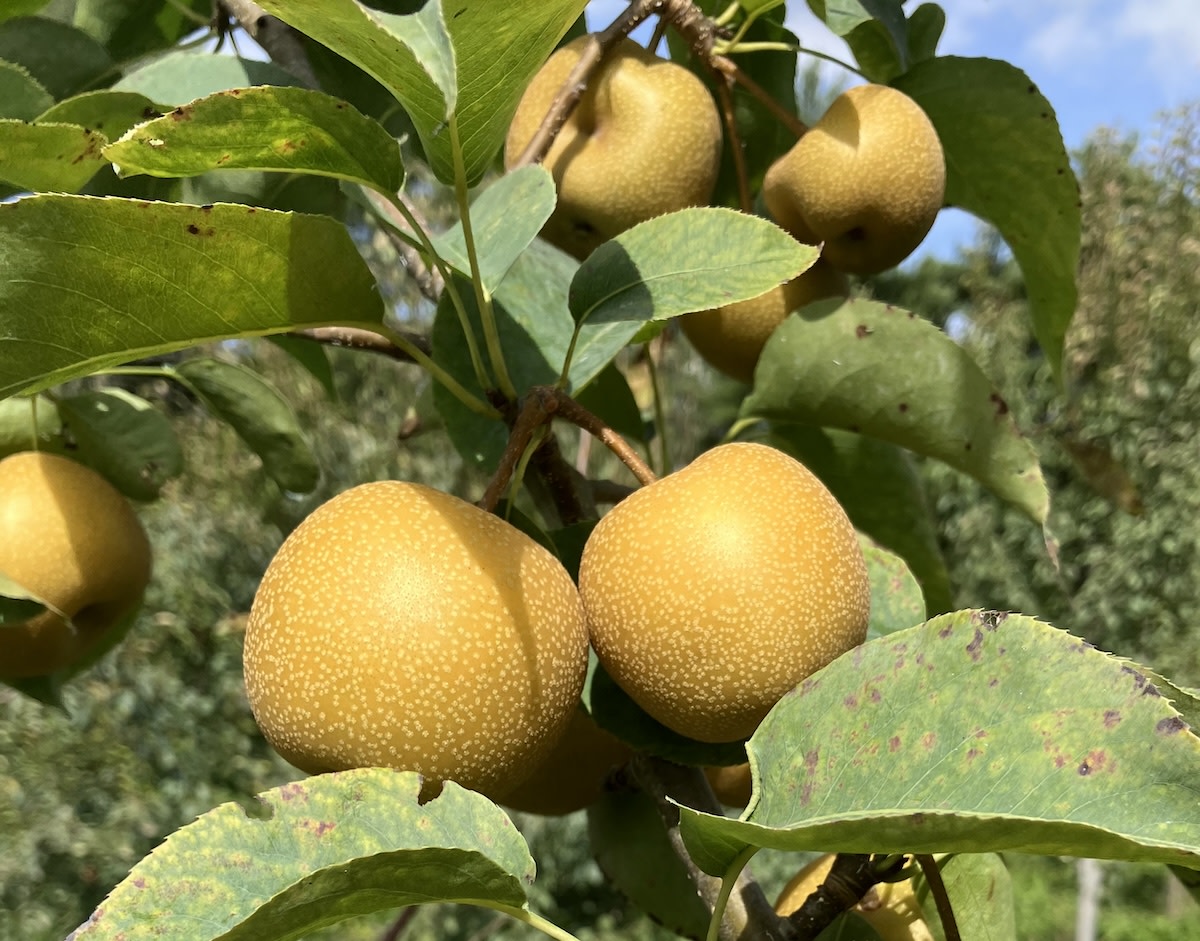 Fine-textured off-white flesh is crisp, juicy, aromatic and sweet. Large conic light brown russeted fruit. Means ‘good pear’ in Japanese. It is a good variety! One of the folks at Fowler Nurseries described it to us as having “a little bit of a zip” to it. Harvest after Hosui and before Shinko. Upright medium-vigorous tree. Moderate tolerance to fireblight. Z4/5. (3–6' bare-root trees)