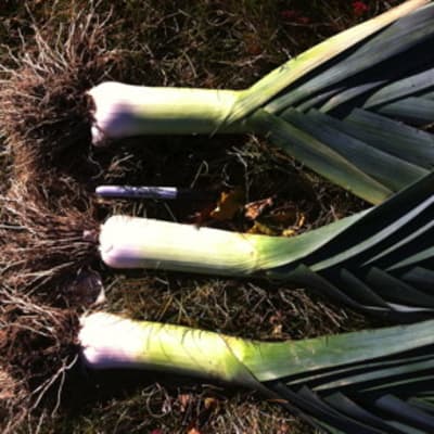 Allium ampeloprasum (porrum group) (100 days) Open pollinated. Highly uniform and reliable OP leek with impressive cold tolerance, gorgeous dark blue-green leaves, and medium-length white shanks.