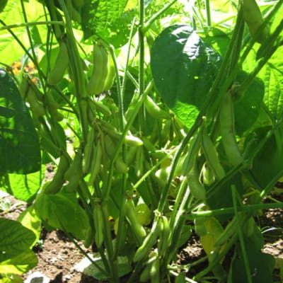 Glycine max (83 days) Open pollinated. Large beans with exceptional soybean flavor when eaten fresh. 2' compact plants are great for small gardens.