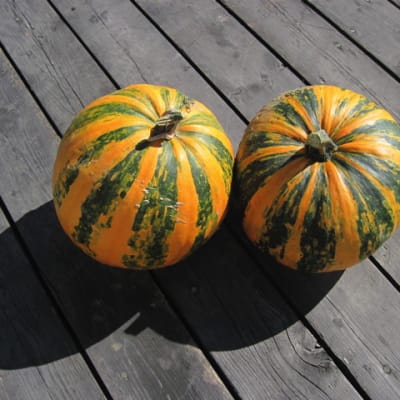 Cucurbita pepo (100 days) Open pollinated. Heirloom. 7-8 lb rich-orange globed fruit with distinct finely russeted netted skin. Excellent for pies.